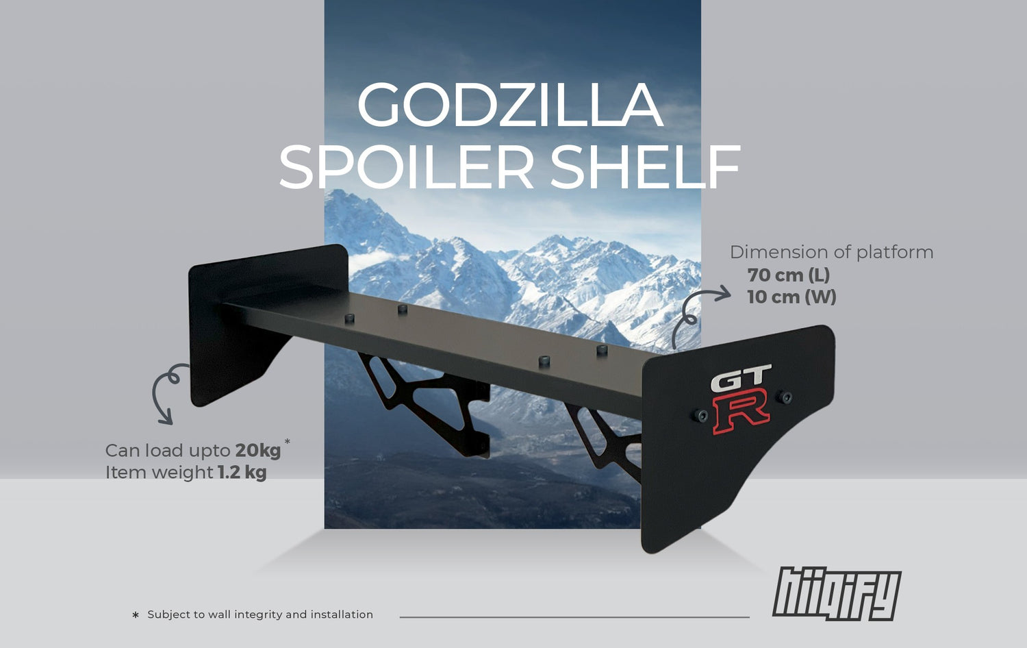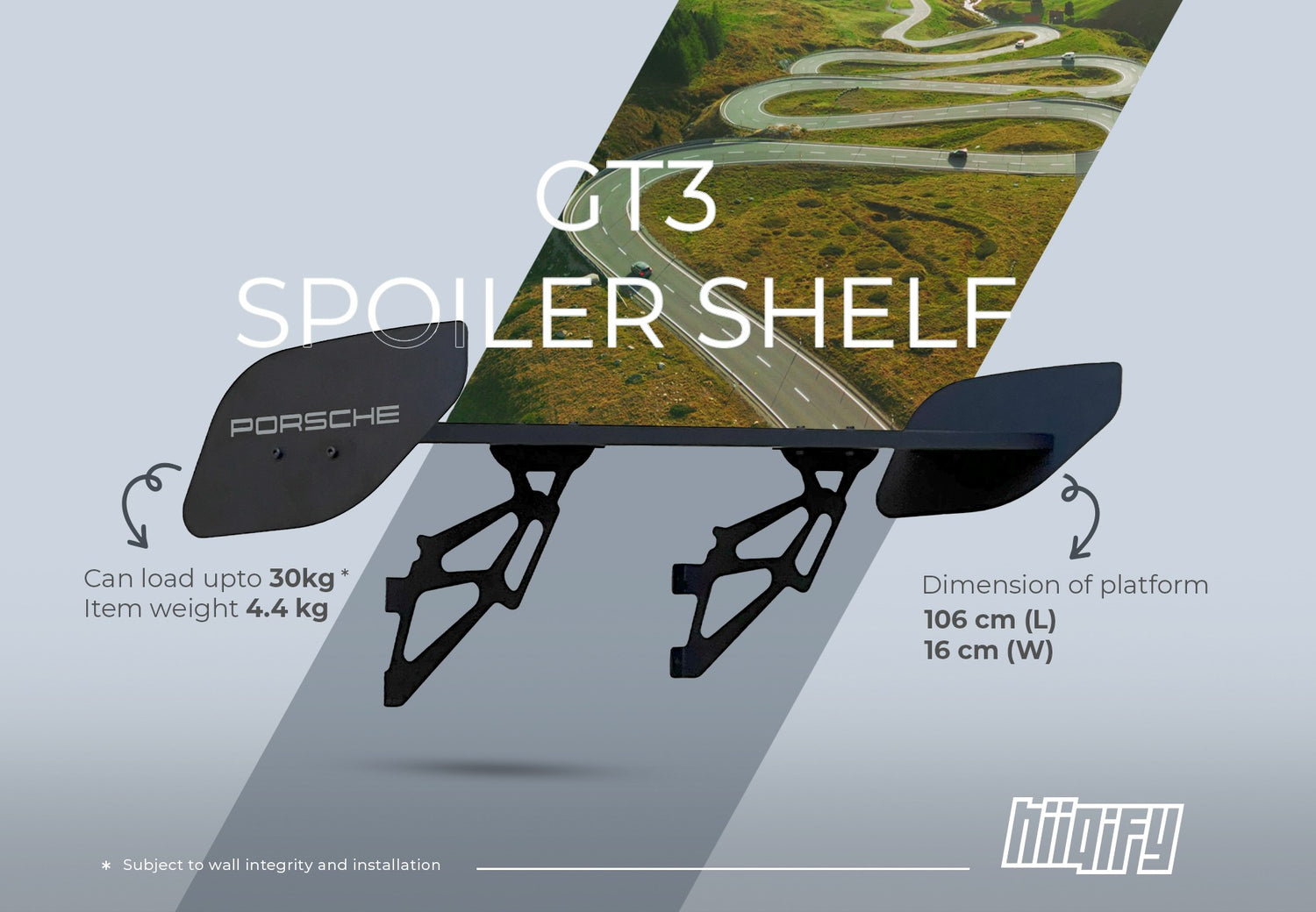 The GTR Spoiler Shelf is engineered to support up to 20 kg of weight when properly installed.Please note: actual load capacity may vary depending on the strength and integrity of the wall it's mounted on.